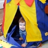 Мы торжественно предподнесли подарок имениннику и взялись за строительство игрового домика – циркового шатра. Неожиданно для нас, шатер оказался размером чуть больше, чем мы его себе представляли, хорошо что, он достаточно гармонично вписался в пространстве.