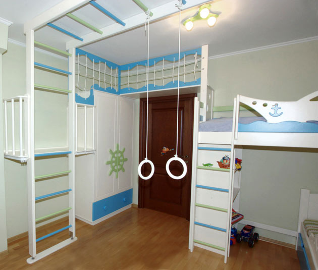Здесь мы можем использовать съемные варианты, задействовать для этих целей потолок и нишу над дверью. Подойдут подвесные качели и кольца, веревочные лестницы. Мало места будет занимать шведская стенка, остается только выбрать для размещения подходящую стену.