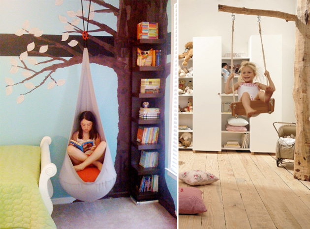 Если размеры комнаты позволяют, можно сделать дерево с качелей – это сложная конструкция, для встраивания которой в помещение необходимы специальные умения и знания.