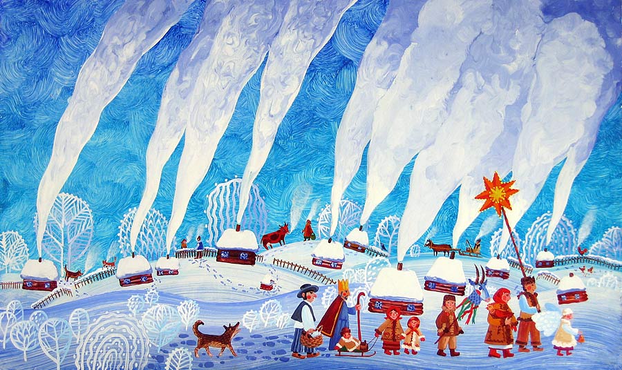 Ее зимние и рождественские иллюстрации построены вокруг традиционных праздничных действий и наполнены радостью, покоем, светом и внутренним теплом. На них присутствует традиционная атрибутика рождественских украинских гуляний – вертепов, символами которых являются Рождественская звезда, которую носят на высоком шесте, коза (ряженый человек в маске и шкуре), наряженные в праздничные одежды дети, поющие песни.