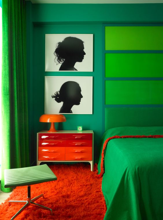 Самое интересное решение с зеленым и оранжевым цветами – ансамбль оливкового и апельсинового оттенков – необычный, творческий, вкусный!
