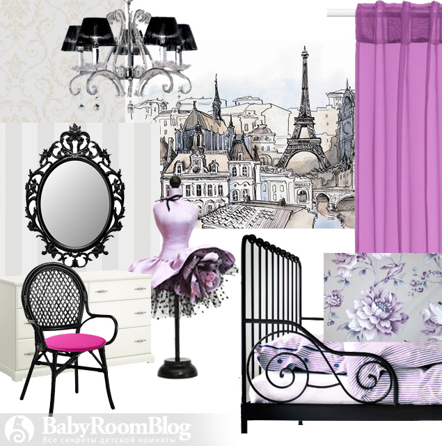 Мы предлагаем добавить в детскую комнату настроение весеннего Парижа. Для создания парижской атмосферы в интерьере используйте детали – изысканные витые кованые спинки кроватей, романтичные рамы для зеркал и картин, хрустальные люстры, изображения с видами Парижа и Эйфелевой башни. В декоре стен хорошо будут смотреться тонкие молдинги, обои в вертикальную полоску и с рисунком – дамаск. Цветовые сочетания, ассоциирующиеся с Парижем: розовый с черным и белым, сиреневый с черным, черный с кремовым.