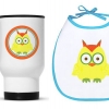 - Образ совы мы разместили на магнитах, слюнявчике и большой кружке-термосе. (Сову отрисовали в фотошопе, загрузили картинку на Printdirect.ru, выбрали предметы, на которых хотели увидеть изображение и отправили в печать)