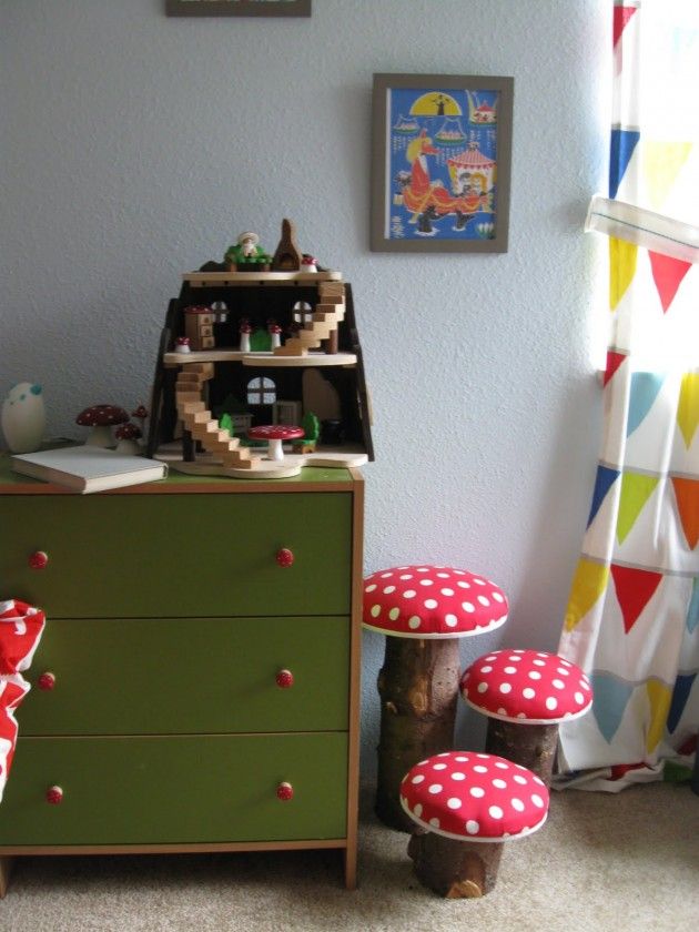 Стены сказочной детской разумнее оформлять в светлых тонах – светло-зеленом, бежевом, светло-коричневом. Так, стены можно с помощью разных цветов разделить на декоративные зоны – верхнюю сделать небом, нижнюю – землей. Яркими акцентами будут служить элементы декора – панно, аппликации, картины. Сделать интерьер ярким могут и тематически стилизованные предметы мебели, аксессуары. Интересная идея – стулья и пуфики в виде мухоморов, необычные диванные подушки, часы и светильники в виде фигурок животных и сказочных персонажей.