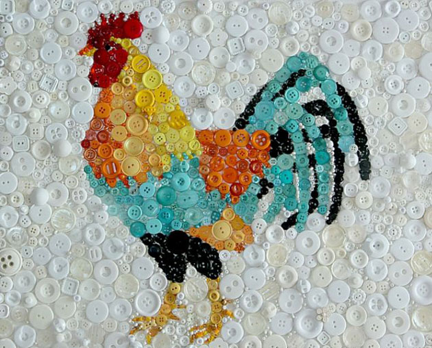 Очень понравились петушки в стеклянных шариках и вышитые на панно из пуговиц. Новый Год будет еще не раз, можно сделать украшения в такой технике. Прямо душа радуется!