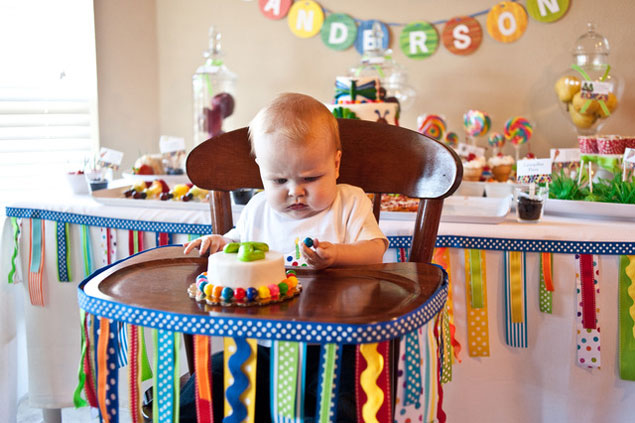 Детский стульчик – это главное место для украшений. Украшения могут сочетаться, например, с головным убором именинника или его нарядом. Можно на стульчик посадить гусеницу и, конечно, поставить именинный торт.
