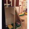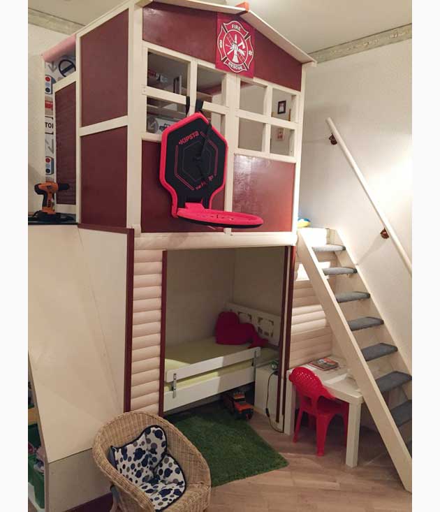 Наша детская комната – 20,6 кв.м. Высокие потолки (310 см) позволили нам создать игровую зону на втором этаже. Эту “пожарную станцию” муж сделал для любимого сына своими руками. Он не мастер по дереву, работает совсем по другому профилю, просто руки правильные.