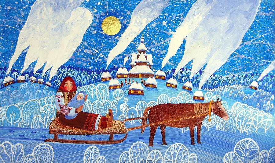 Ее зимние и рождественские иллюстрации построены вокруг традиционных праздничных действий и наполнены радостью, покоем, светом и внутренним теплом. На них присутствует традиционная атрибутика рождественских украинских гуляний – вертепов, символами которых являются Рождественская звезда, которую носят на высоком шесте, коза (ряженый человек в маске и шкуре), наряженные в праздничные одежды дети, поющие песни.