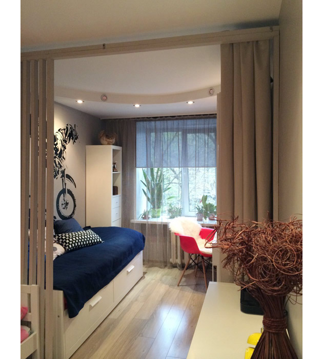 Здравствуйте.Очень понравилась Ваша идея по зонированию комнаты, у нас такая же комната и решила сделать также как и Вы. Скажите пожалуйста где Вы покупали шторы? И можно фото освещения ( если не трудно на почту [email protected])