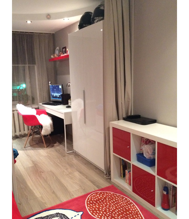 А мне кажется, наоборот хорошо, что у Никиты пол без ковра. Так еще заметнее разные “зоны”. К тому же это маленькой девочке нужен коврик, а мальчишкам он не обязателен))